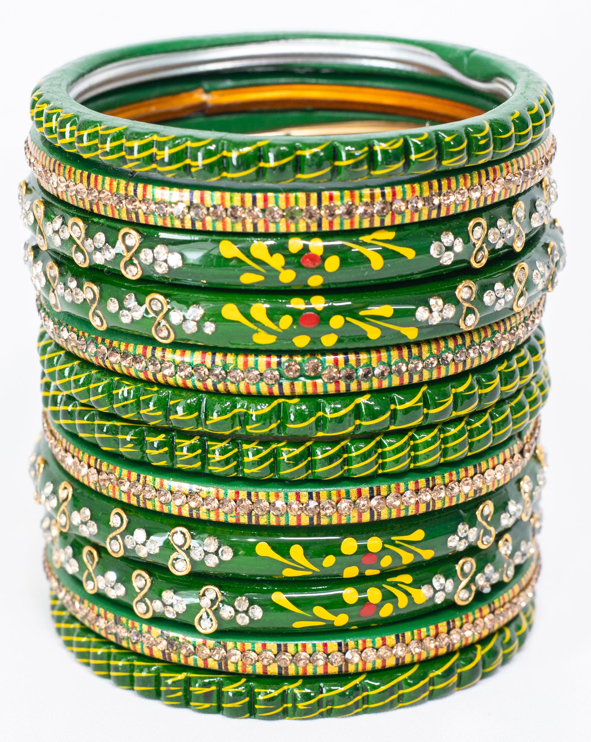 - Swara Creations Lac Bangles Set: Adorn your wrists with this vibrant set of 12 Lac bangles featuring intricate zircon work, available in stunning red, yellow, and green colors.